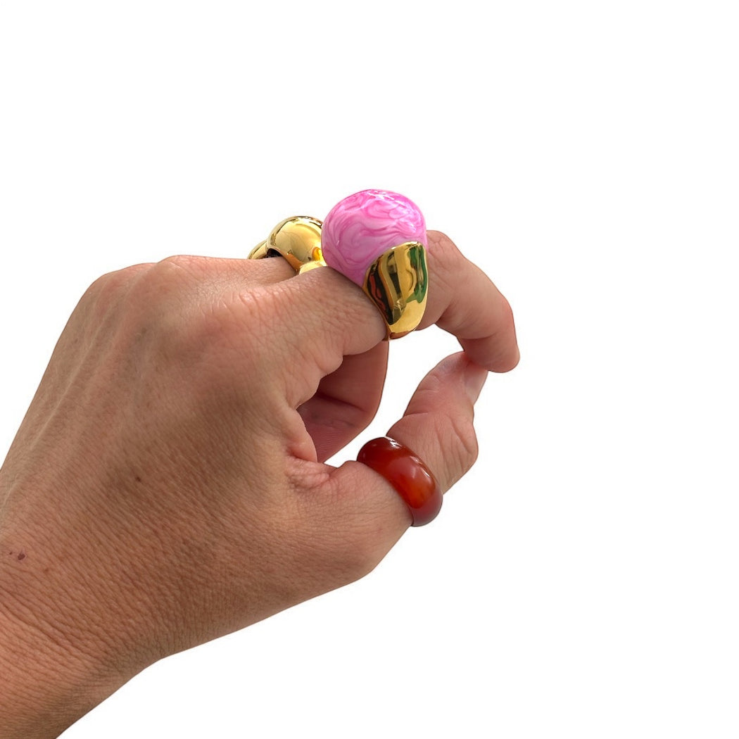 Crafted from durable stainless steel and plated in 18K gold, the ring boasts a smooth, high-shine finish while maintaining a bold, chunky profile. The oversized design is guaranteed to turn heads, while the colors add a pop of personality and depth. Offered in size N, this ring is perfect for those who love to make a statement and wear something truly unique.