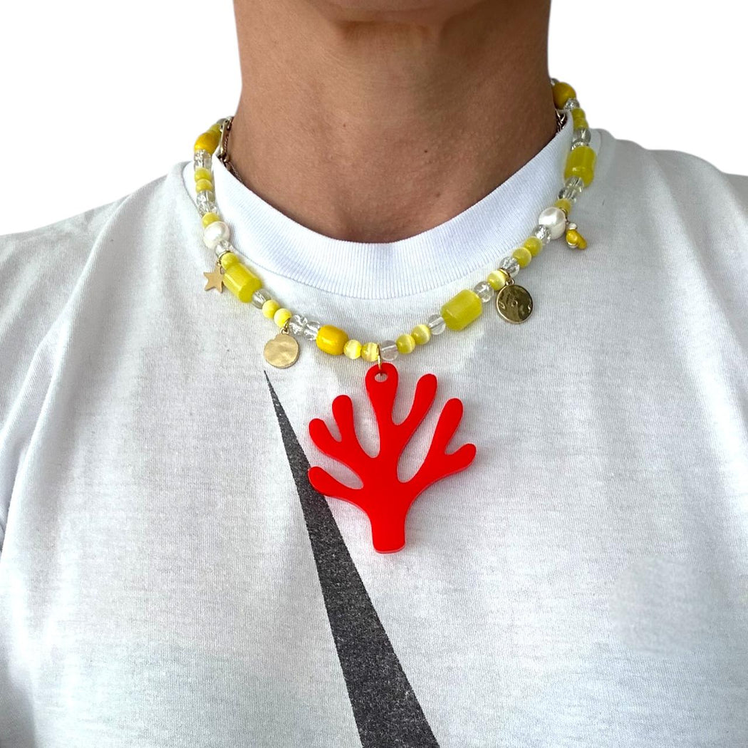 Hand-beaded and full of character, this one-of-a-kind necklace features a Perspex coral pendant made in Cape Town and charms gathered from everywhere. Strung by hand, no two are ever the same, a little wearable joy for your neck.
